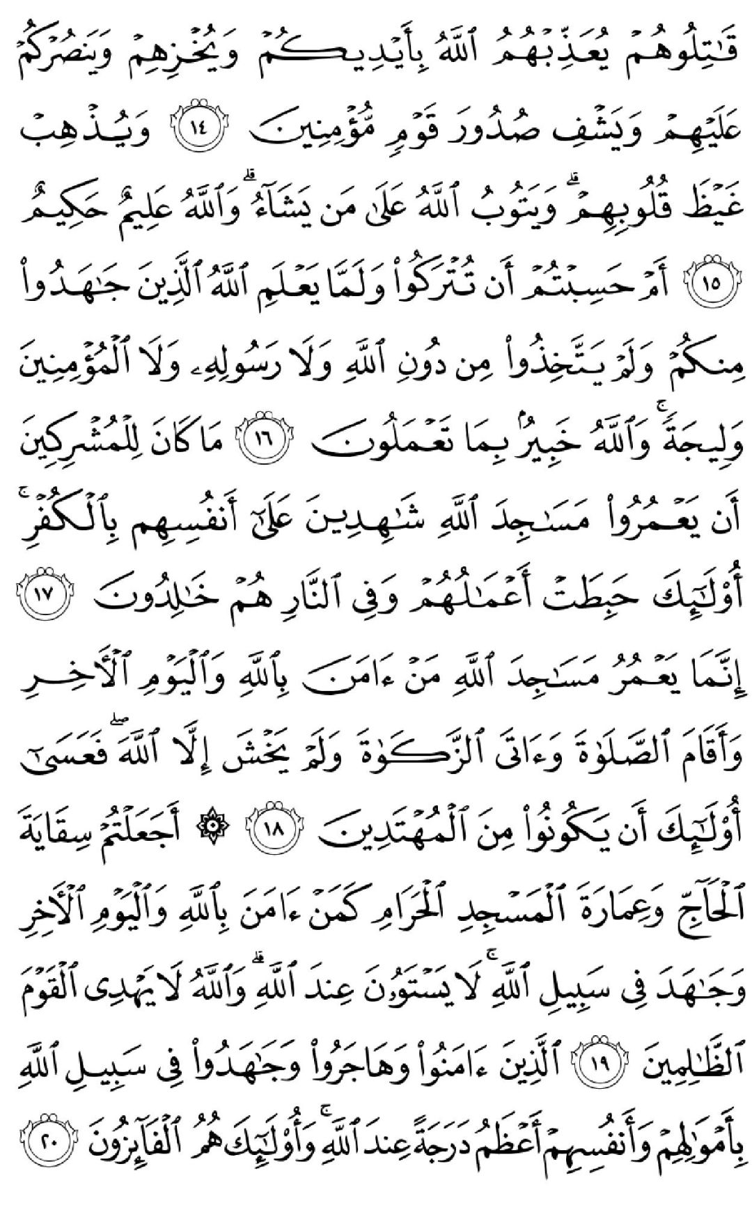 با آنان بجنگید تا خداوند آنان را به دستهای شما عذاب کند و خوارشان سازد و شما را بر آنان پیروز کند و دلهای (پردرد) مؤمنان را تشفّی و مَرهَم نهد