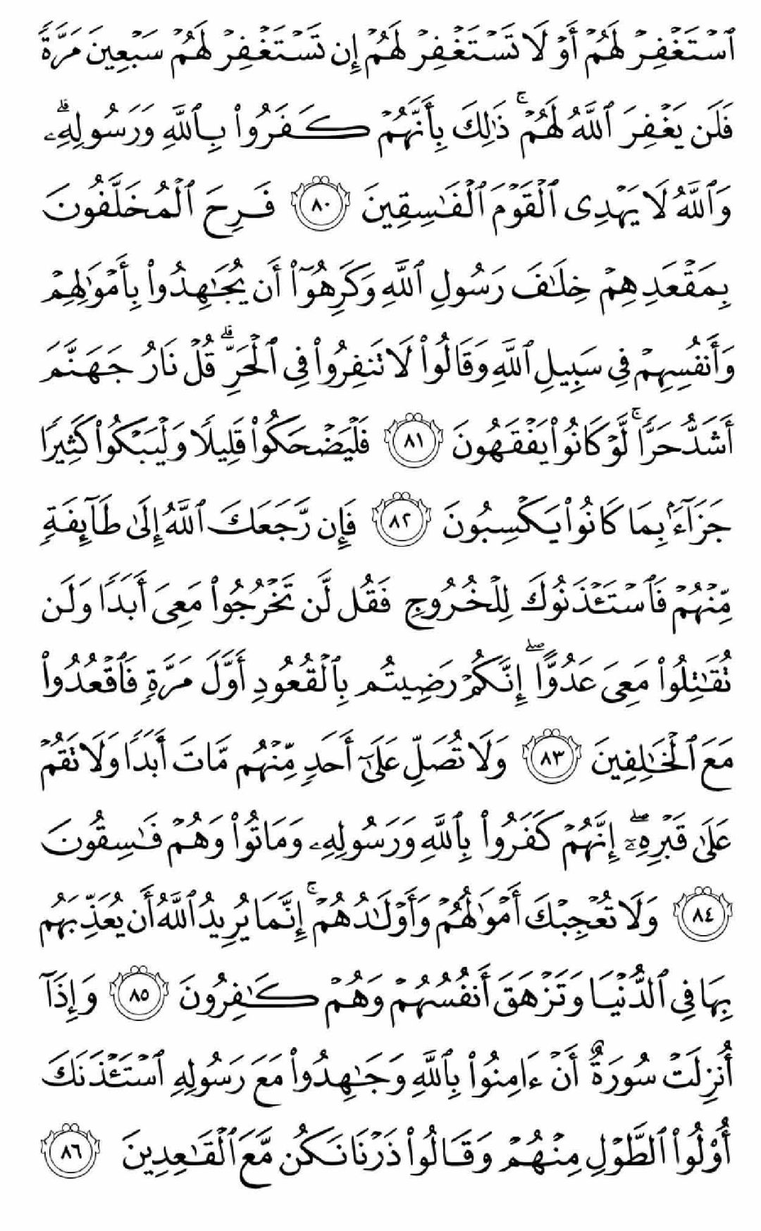«اسْتَغْفِرْ لَهُمْ أَوْ لا تَسْتَغْفِرْ لَهُمْ إِنْ تَسْتَغْفِرْ لَهُمْ سَبْعِینَ مَرَّةً فَلَنْ یَغْفِرَ اللَّهُ لَهُمْ ذلِکَ بِأَنَّهُمْ کَفَرُوا بِاللَّهِ وَ رَسُولِهِ وَ اللَّهُ لا یَهْدِی الْقَوْمَ الْفاسِقِینَ» «برای منافقان استغفار کنی یا استغفار نکنی، (یکسان است) اگر هفتاد بار برایشان آمرزش بخواهی، خداوند هرگز آنان را نخواهد بخشید. این (قهر حتمی الهی) به خاطر آن است که آنان به خدا و پیامبرش کفر ورزیدند و خدا، گروه فاسق را هدایت نمیکند.»